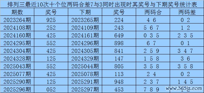 十个位合差分析:上期奖号十个位开出25组合,两码合为7,两码差为3,最近10次十个位两码合7与两码差3同期出刻下,其奖号和下期奖号区别为: