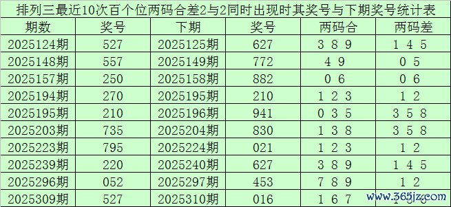 从以上统计不错看出,百个位两码合差2与2同期出现之后其下期两码合差进展最热的4个区别为:1358,本期百个位两码合差不错参考这四码中的数据。