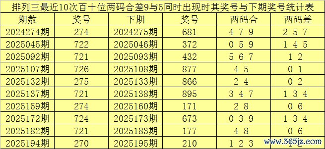 从以上统计不错看出,百十位两码合差9与5同期出现之后其下期两码合差进展最热的4个区别为:0124,本期百十位两码合差不错参考这四码中的数据。